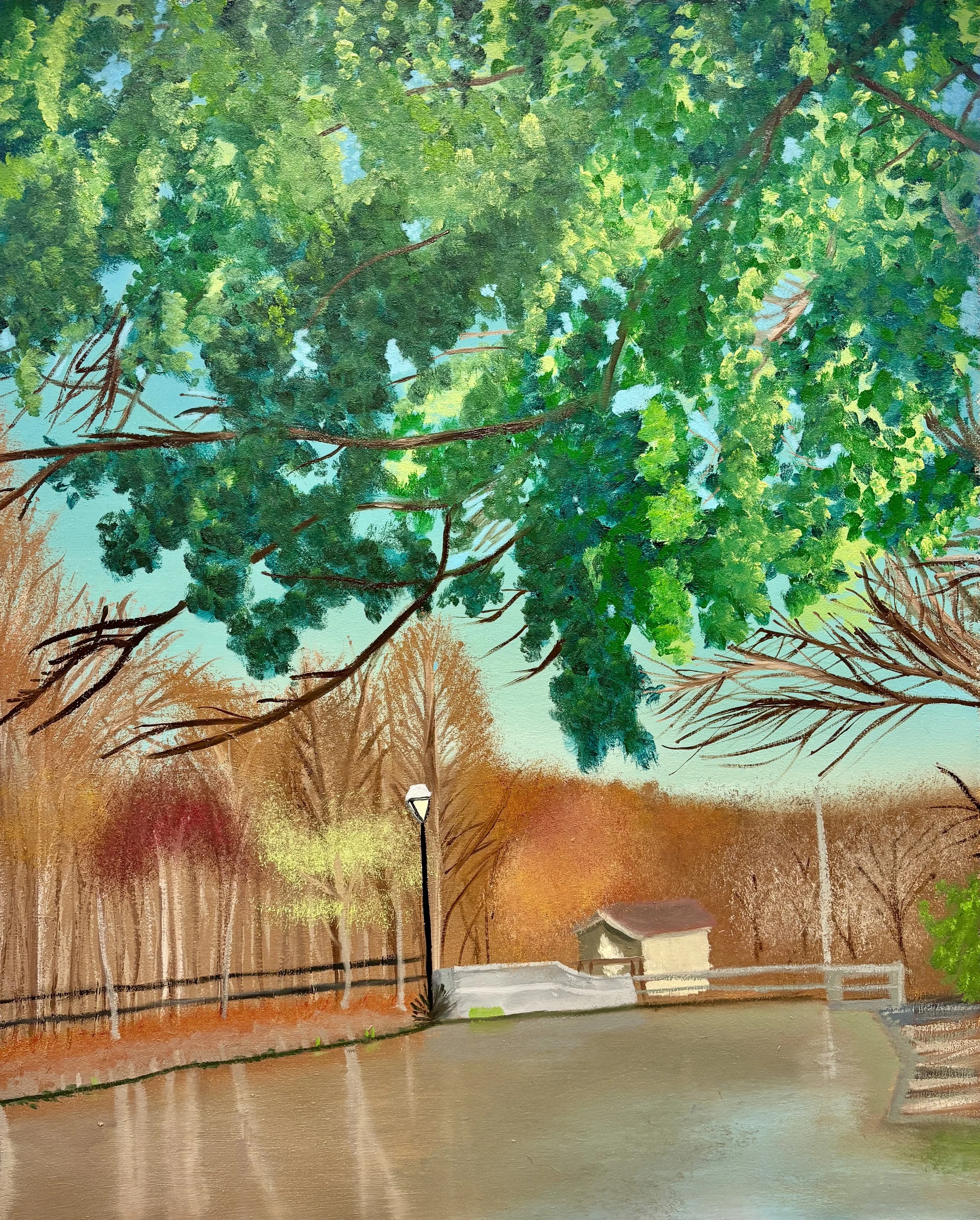 "Burnett Woods" Marley Kidd, Oil on wood panel, 12x24". This painting encapsulates the view over looking the lake at Burnett Woods. This painting was a landscape study to familiarize the gestures and techniques going into landscapes.